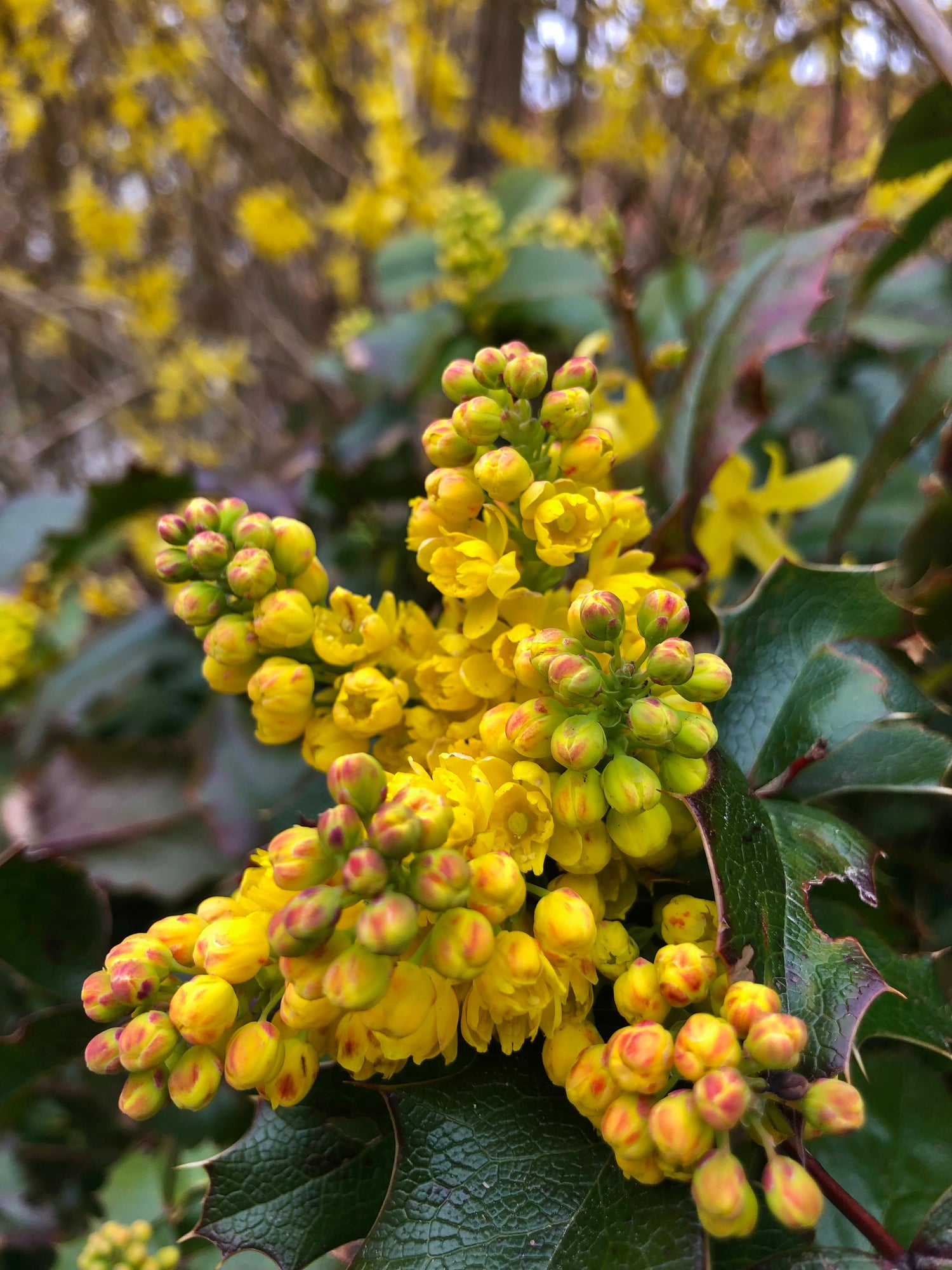 Mahonia’s bold yellow flowers stand out in a winter garden. Its long-lasting blooms help support overwintering bumblebees and honeybees.